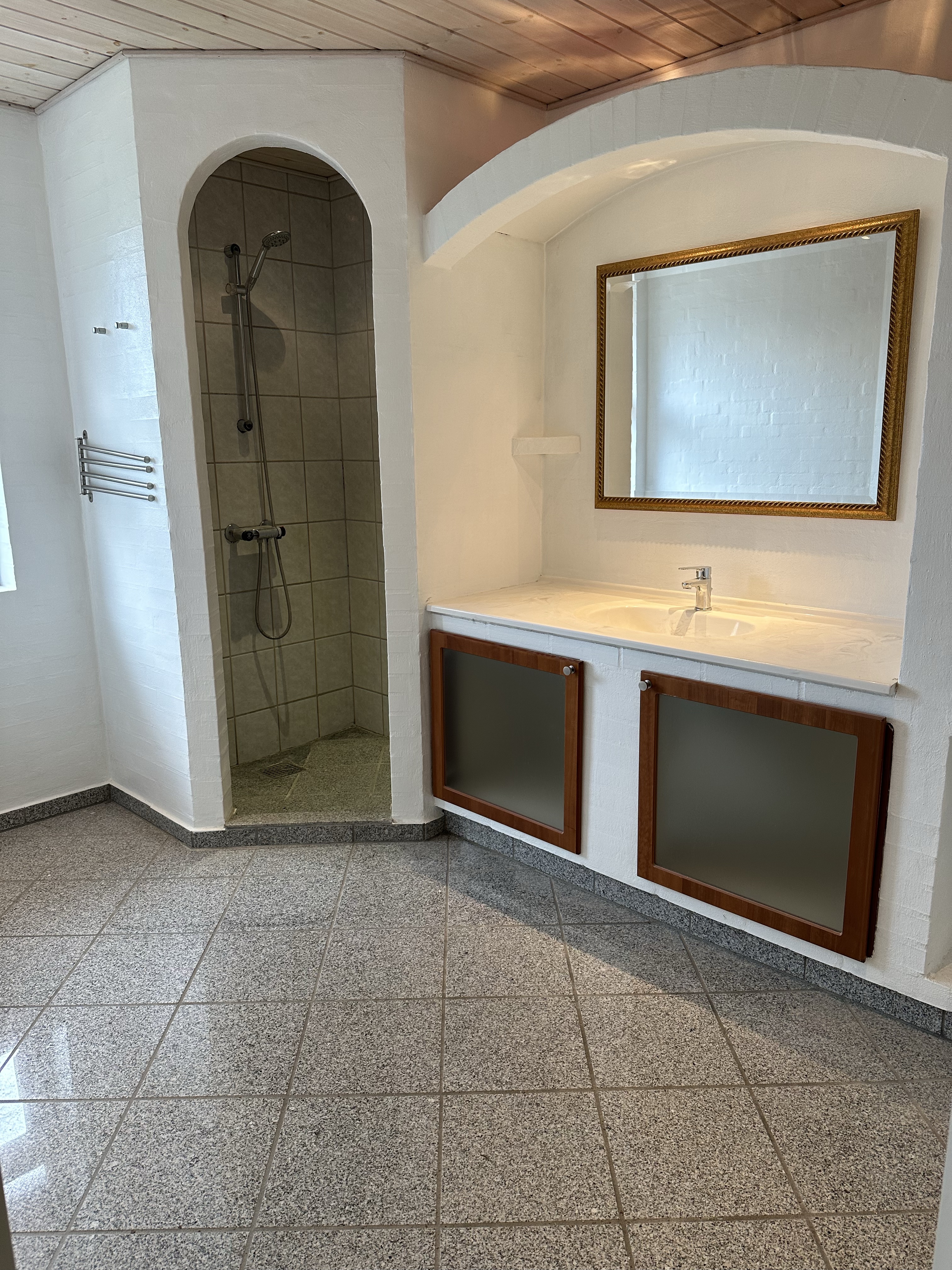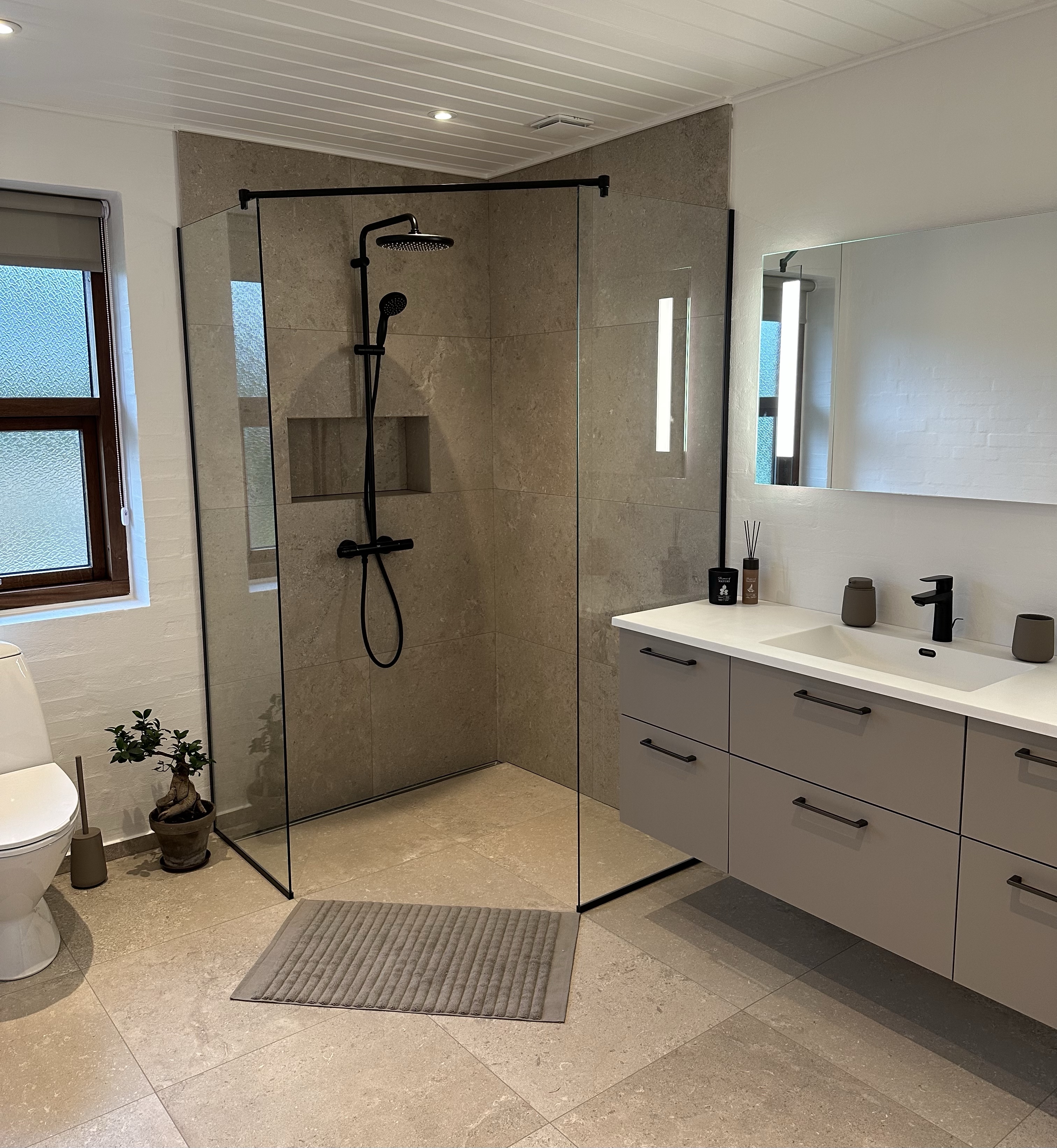 I 2023 fik vi til opgave at lave et moderne badeværelse med kvalitetsmaterialer. Her blev lagt 60X60 gulv- og vægfliser samt installeret unidrain gulvafløb.